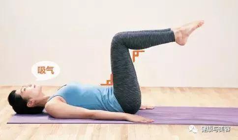 仰卧,双臂放于体侧,双手紧贴地面。一边吸气一边并拢双膝并上抬,直至髋关节与膝盖呈直角。伸展脚趾尖。