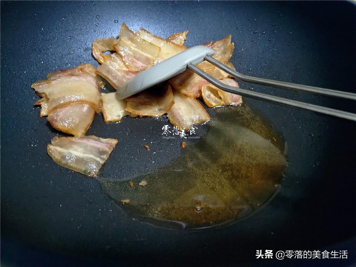 4、不粘锅别倒油,直接放入腊肉,小火加热,直至腊肉变得透明;这个时候,锅里已经有很多油了;