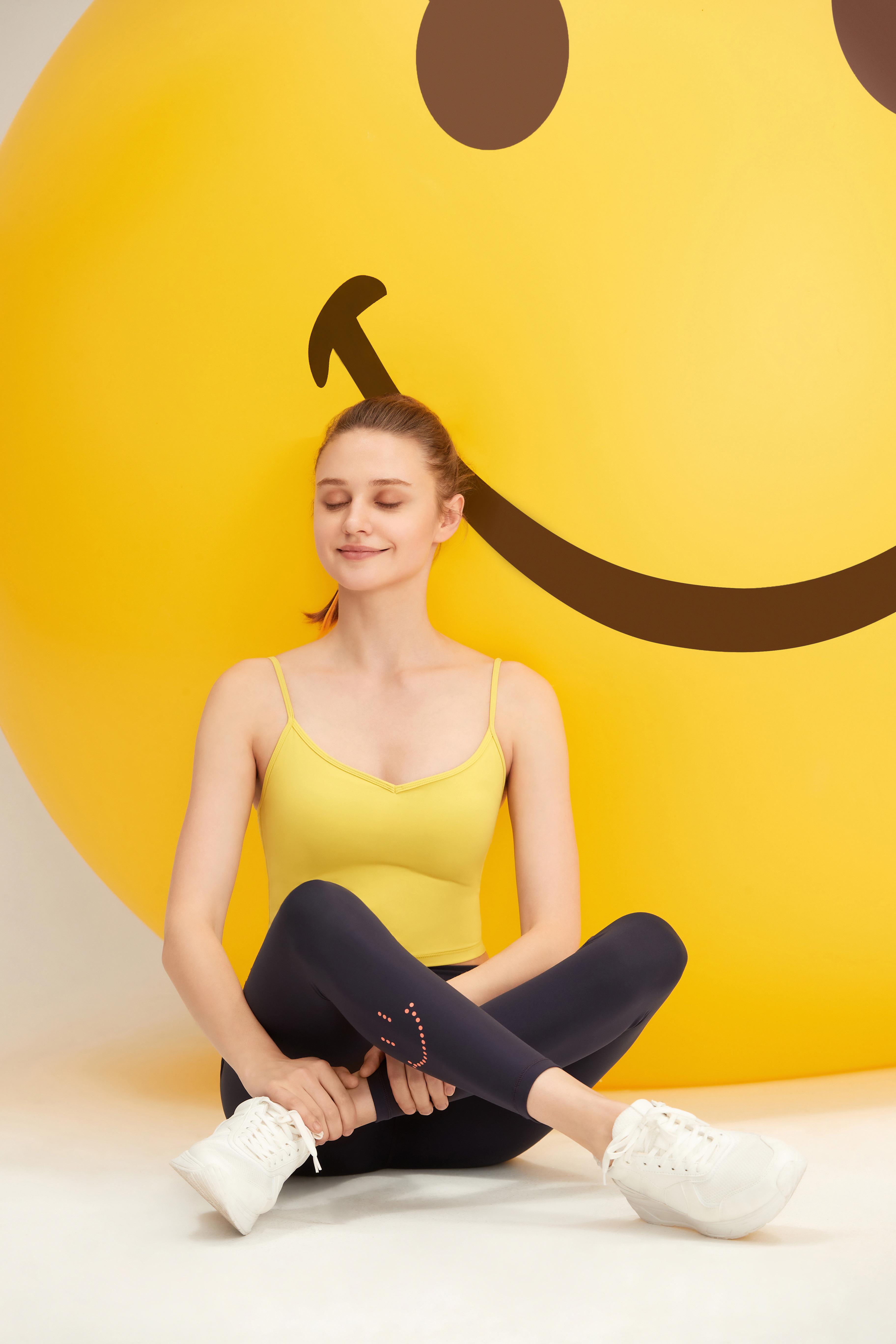 穿搭3:经典款瑜伽吊带,搭配高科技笑脸印花瑜伽裤,整体清爽明亮,带来满满的活力感。