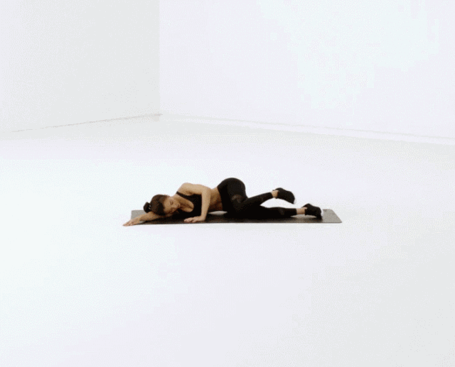 侧卧左侧前踢腿和侧卧右侧前踢腿各做30秒,平稳呼吸,保持紧绷感而不疼痛。