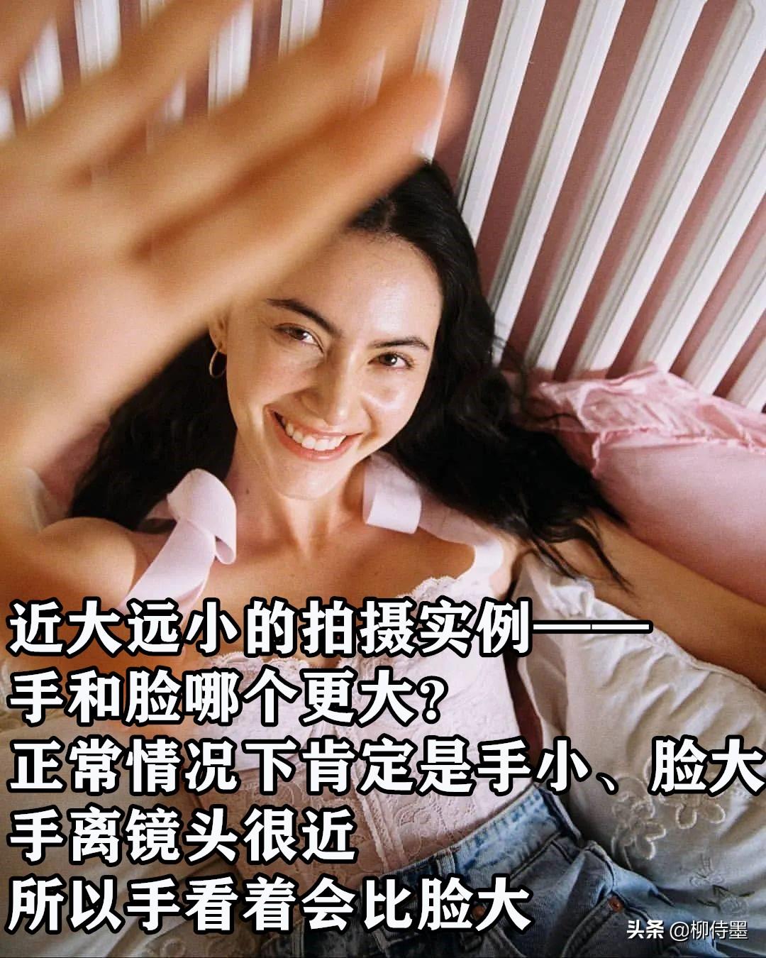 让眼睛离镜头近一点,让下巴离镜头远一点。