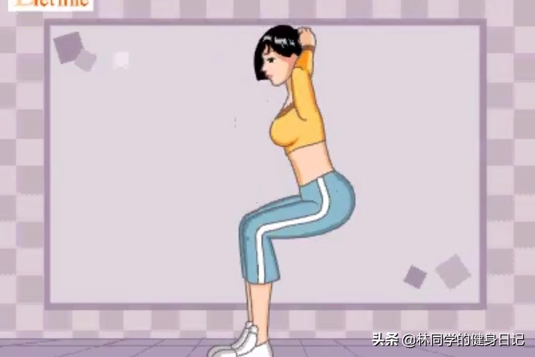 动作二:双脚并拢保持站立姿势,双手屈肘向上抬起,在脑袋后面做十指交叉的动作;以膝盖为分割点,大腿以上位置做向后“坐”的动作。“坐”的时候以臀部为着力点,腰、背、肩三点一线保持竖直。这个动作看起来很轻松,实则很考验耐力,对于体力也是一场巨大的损耗,稍有不慎就会让重心落空,所以大家一定要注意每一个细节,做到仔细仔细再仔细。