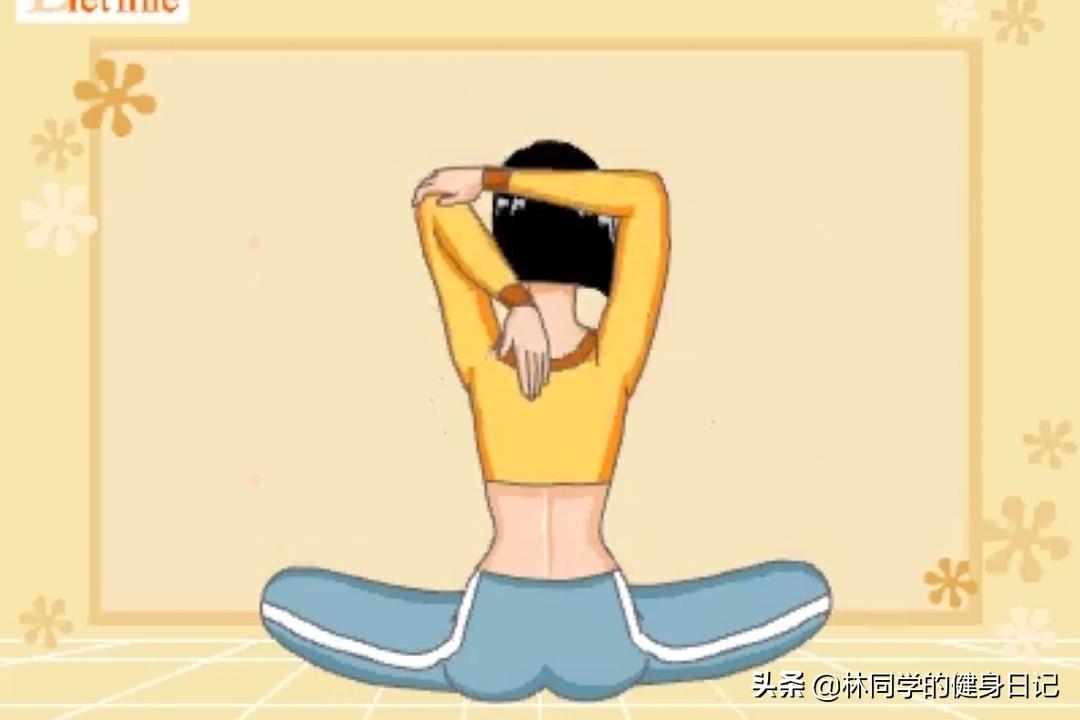 动作四:双腿屈膝而坐,双腿保持一腿搭在另外一条腿上面的姿势;吸气收紧腹部,肩部下沉,挺直腰背,让背部的脊椎感觉到向后拉伸的压迫感;右手屈肘往背后延伸,五指并拢,掌心不断贴着背部往下,直到感觉到疼痛停止;左手屈肘从耳侧出发,沿着脑袋向右侧伸展,五指依旧并拢,触碰到右胳膊肘挺直即可。这个动作的练习有两大好处,一是符合我们的标题,即减肥。还有另外一个好处,那就是改良气质。在双手向后拉伸的过程中,背部的脊椎也会相应调整,久而久之圆肩驼背等问题就会不复存在了。