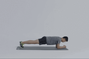 身体后侧的肘部弯曲,但是前臂要竖直,整个身体下降的同时收紧腹部并且尽力抬右膝朝胸部的方向。肘部弯曲不要超过90度,保持一秒钟,回到初位置,但是记住右脚不要着地,然后继续动作。每条腿连续做六次动作为一组。