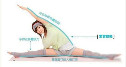 坐在垫子上,双腿向侧打开,并保持此动作不动,右手向右边伸展,背脊向上挺直,双腿保持开的姿势,双手也要伸直,感觉到拉伸。