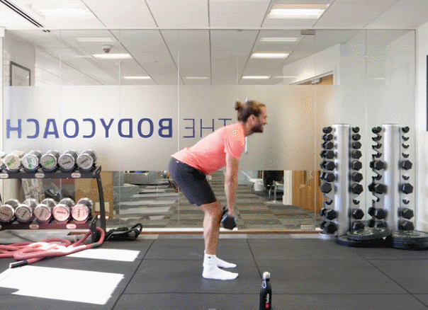 俯身,微微屈膝状态,哑铃从小腿方向上拉,如下图。