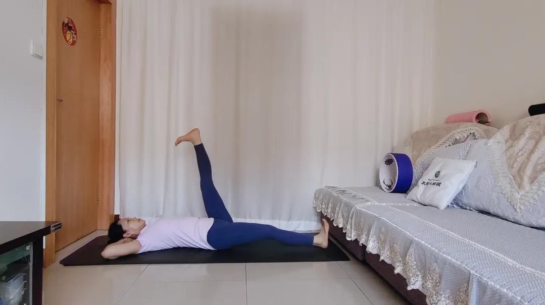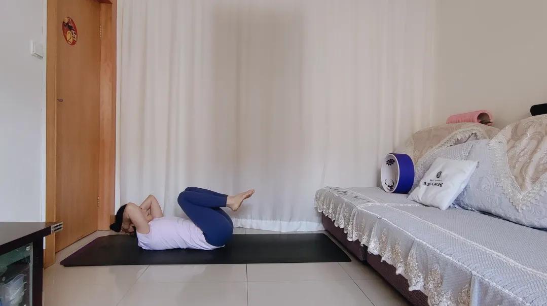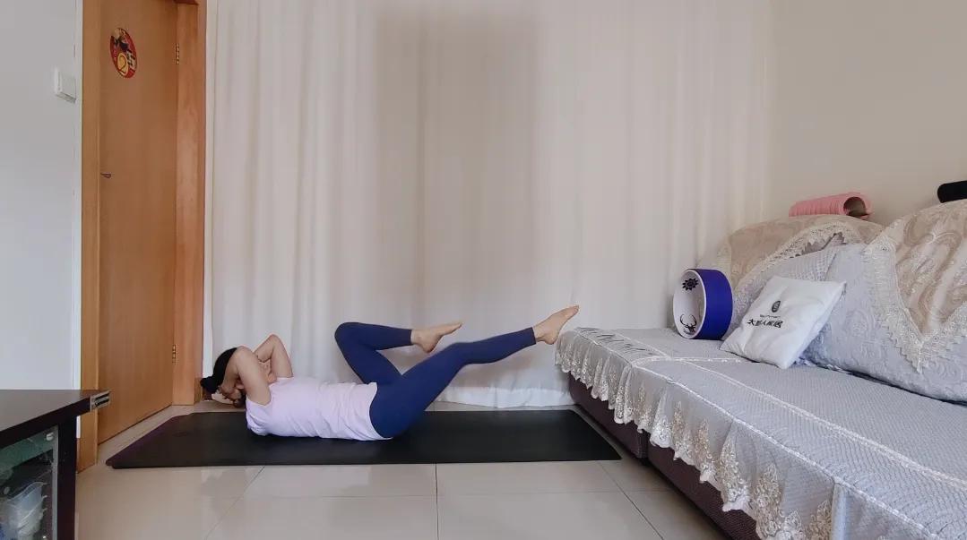 2:单腿提膝卷腹-仰卧在瑜伽垫上,屈膝抬双腿,大小腿成90度,大腿与地面垂直,双手放于耳朵两侧,下腹部发力,让左腿膝盖触碰右手肘,右腿膝盖触碰左手肘,两边交替反复练习,左右为一组,每组做10-15个,做5组。这个动作可以消除下腹部和侧腰的赘肉。