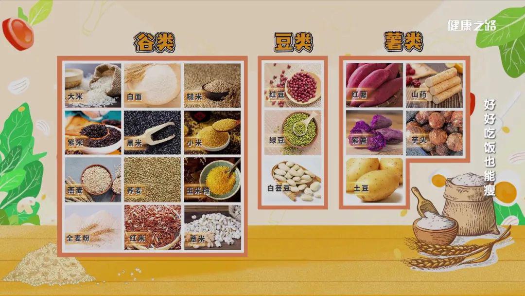 注意:主食除了常见的谷类外,还包括红豆、绿豆、白芸豆等杂豆类,以及薯类。黑大豆、黄大豆、青大豆等都大豆类含蛋白质较高,不能当主食。