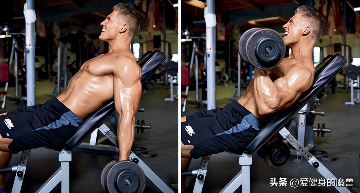 使用上斜板哑铃弯举,从手臂完全伸展的姿势开始,手肘在躯干后面,这样可以大限度地募集肱二头肌的长头。训练的反应从组间拉伸而进一步放大。