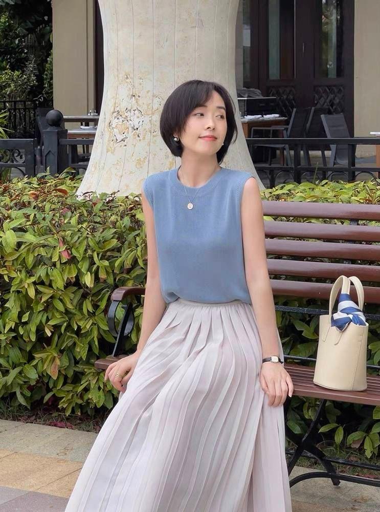 如果更喜欢优雅或者温柔的风格,在进行搭配的时候就可以用柔顺的质地、色彩的柔和来打造氛围感。像图中的look,整体是森系减龄,在色彩上是浅绿色+墨绿色,色彩清新。柔软的无袖针织衫和A字裙呈现的果显瘦又高级,这样的整合感就很高。喜欢这种风格的look,选无袖的时候可以用小木耳边、荷叶边的设计点加入哦~
