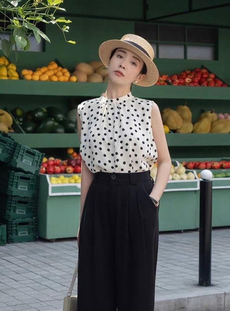 不同身材在挑选无袖衣服的时候要有所着力地去选。很多人觉得无袖衣穿不出果就在于选单品的时候太跟风,没有考虑到自己的身材需要。像是颈长、肩窄、胳膊细的女性就很适合无袖衣,可以说是各种类型、风格的无袖衣都可以轻松驾驭。同时,无袖圆领波点衫能放大这类女性的身材优势,显瘦又有气质。