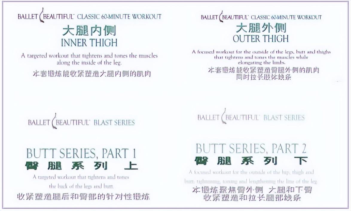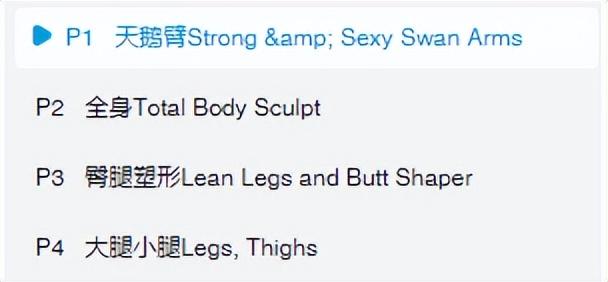 形体塑身-美丽芭蕾里面的课程,按照我们熟悉的大概分成3大部分:天鹅臂、天鹅腿、全身塑形。