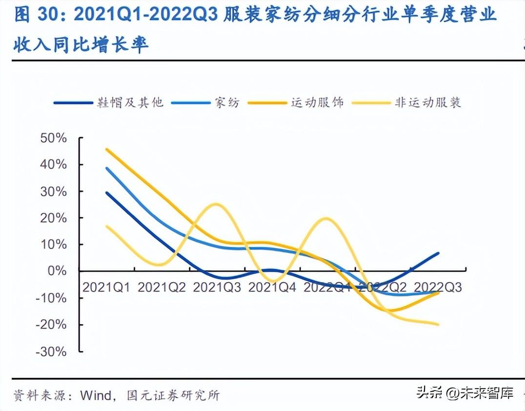 疫情及宏观环境影响下,纺织行业低产能或逐步出清。根据工信部数据,2022 年 1-9 月,中国规模以上纺织企业工业增加值同比下降 0.4%,营业收入 38563 亿元, 同比增长 3.1%;利润总额 1345 亿元,同比下降 24.0%;行业亏损面 24.3%,同比 扩大 2.7pct。疫情及宏观环境影响下,经营困难的纺服企业数量同比大幅提升,持续 亏损下或逐步退出行业,而头部企业更有抵御经营风险的经验和能力,更有望抓住疫情放开和经济回暖之后的行业机会。