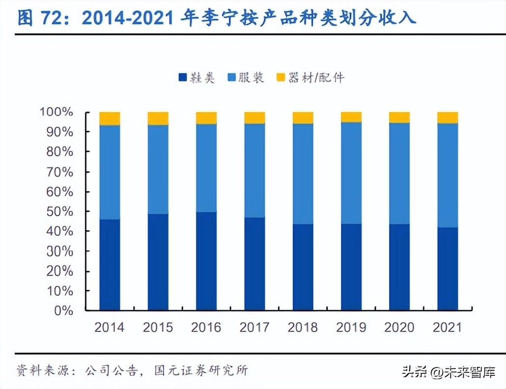 根据公司公告,李 宁鞋类/服装/器材及配件收入占总收入比重分别由 2014 年的 45.3%/46.5%/6.3%变 化至 2021 年的 42.1%/52.4%/5.5%,安踏体育鞋类/服装/配饰收入占总收入比重分 别由 2014 年的 46.1%/49.9%/4.0%变化至 2021 年的 38.8%/58.0%/3.2%。此外, 国产运动服饰品牌对于中高端产品的补足也逐渐推动产品均价的提升,根据魔镜数 据,李宁/安踏淘宝天猫的跑鞋销售均价分别从 2019 年 1 月的 180.78/208.09 元/双 提升到 2022 年 10 月的 318.05/257.20 元/双。我们认为,相较于过去几年由量增驱 动销售额高增长,未来量价齐升尤其是销售单价的提升将推动国产运动服饰收入稳 定增长。