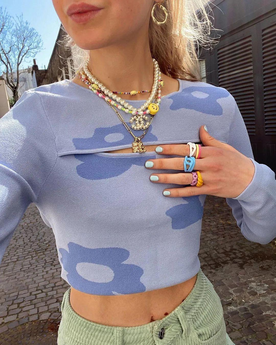 这两年“童趣感”的饰品搭配盛行,彩色的搭配看着就充满乐趣,好玩又好看。串珠项链和果冻戒指就是“童趣感”具代表性的饰品。