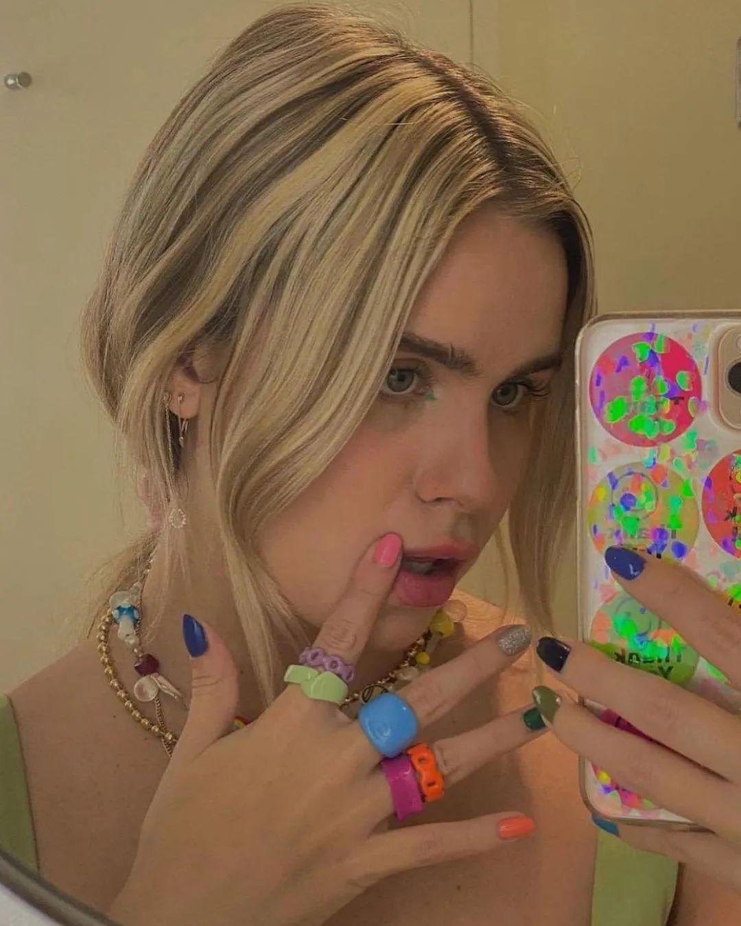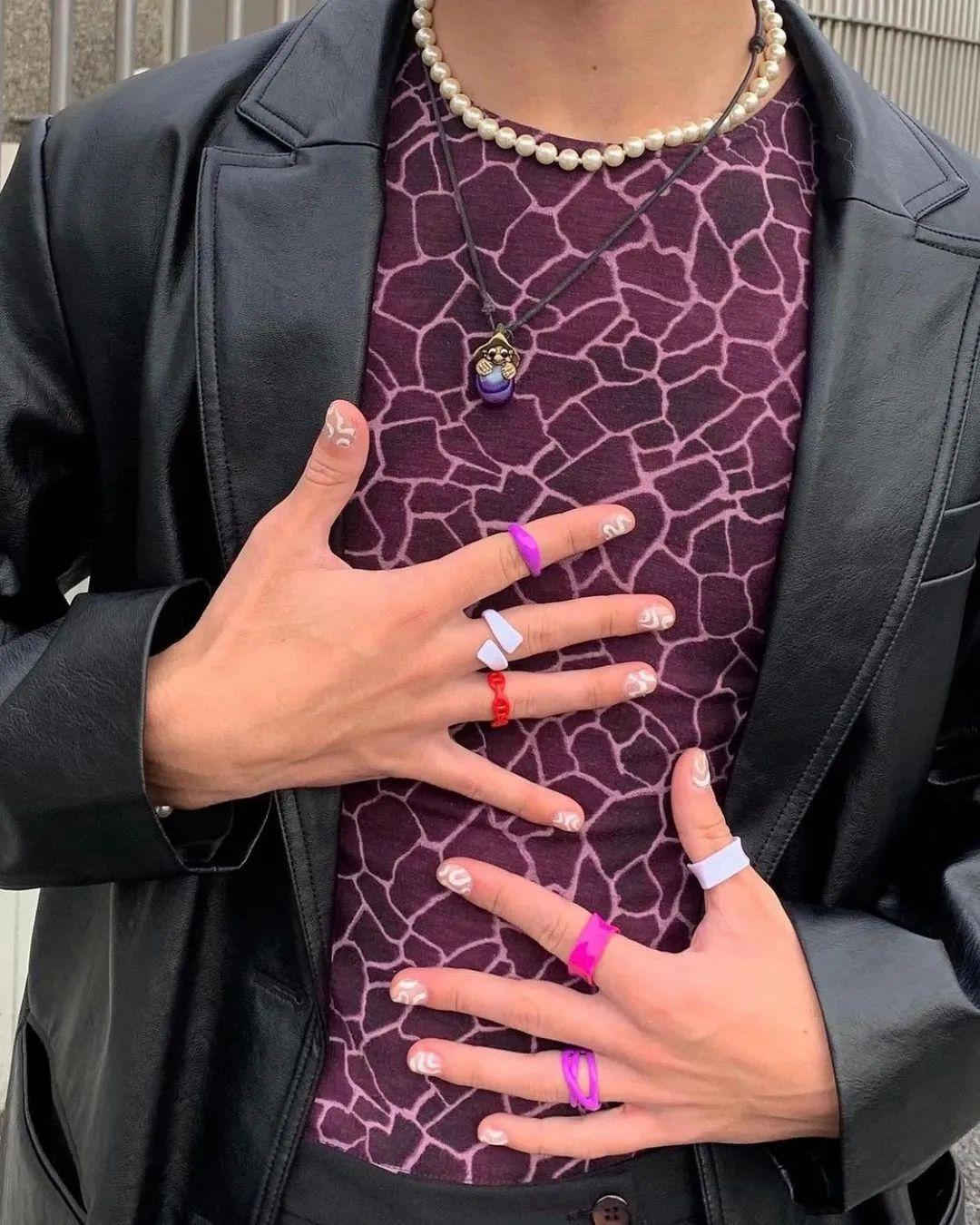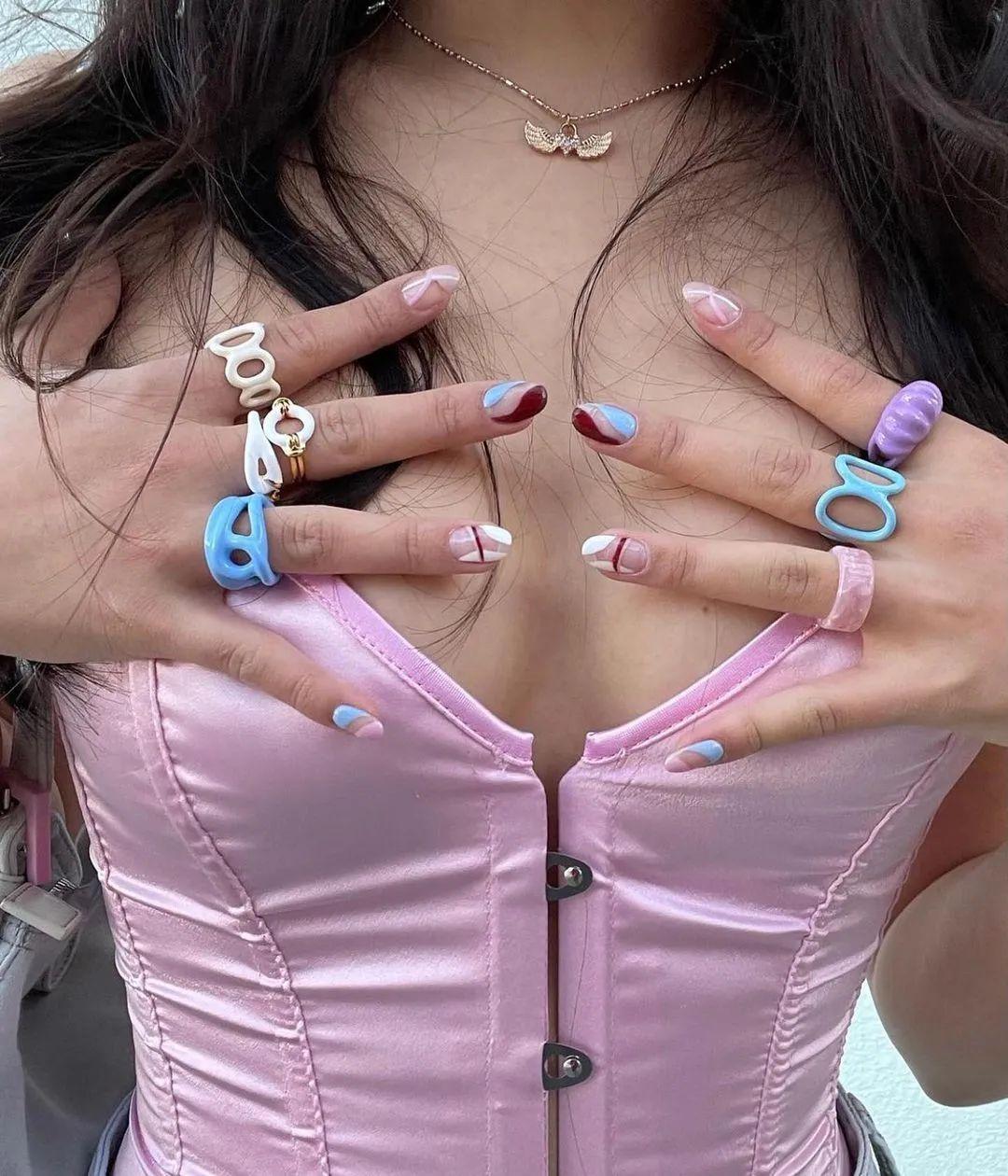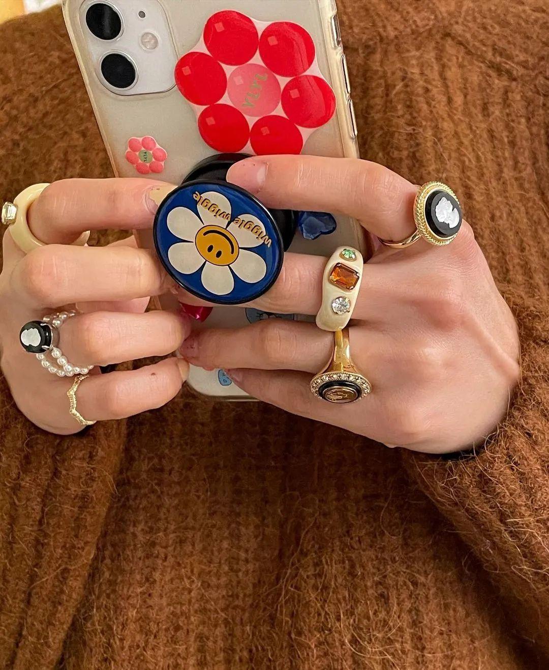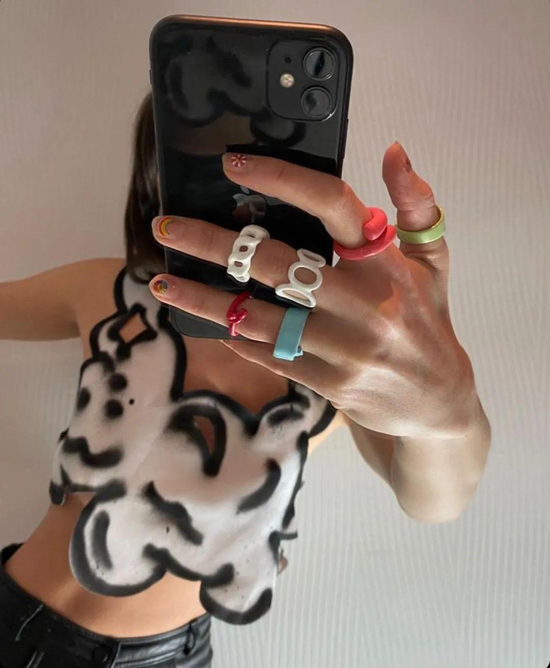 IG博主们更是恨不得 10 个手指统统安排上一个,把小小的戒指玩出了花样。这种戒指真的太适合夏天了,五彩缤纷!