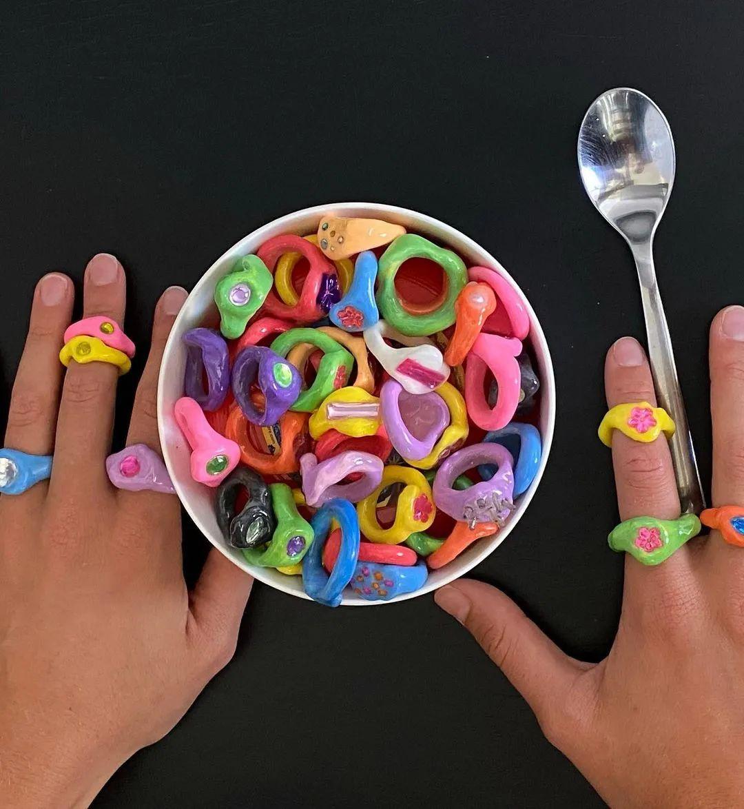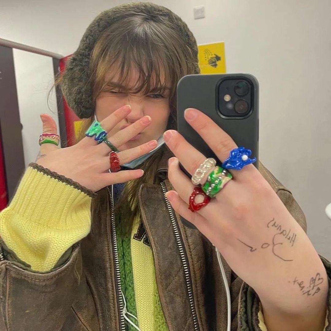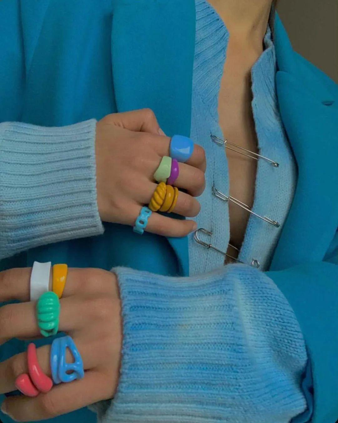 果冻戒指色彩缤纷,形状饱满,造型不规则,外表单看好像小朋友的玩物,充满童趣感。果冻戒指的流行也源于被追捧的「Y2K」风格,多彩塑胶感可爱满分,潮流 Icon 们纷纷上手。