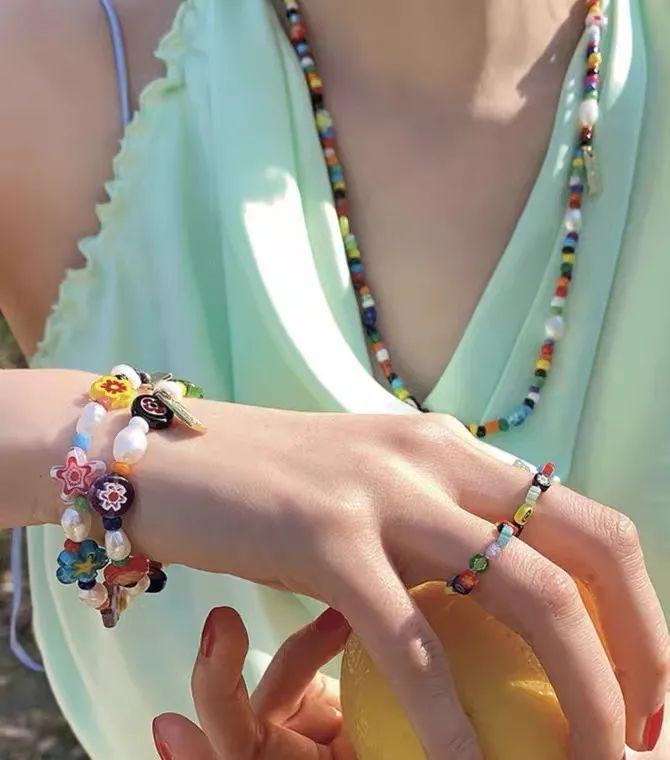 串珠项链这两年也是火到不行,听起来像是小时候爱的项链,色彩丰富,而且可以将不同材质的串珠元素穿在一起,也深受明星艺人的喜爱。