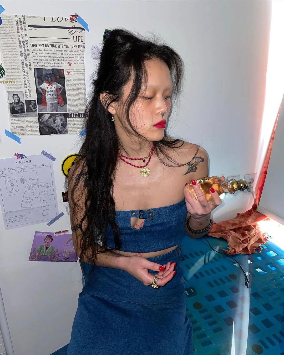 衣服搭配潮流Sense满分,锁链Choker;多戴几款戒指;小吊坠耳环,几个首饰的搭配也都恰到好处。