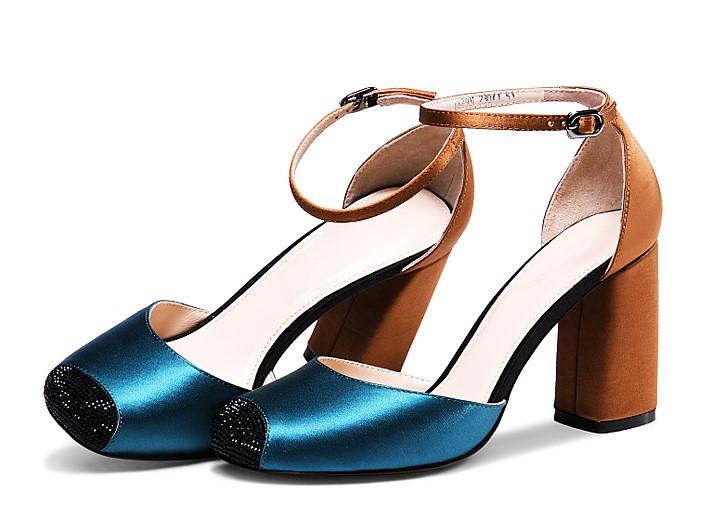 丝绸面料的鞋面富有光泽感,尽显精致奢华品味。鞋头黑色水钻撞色设计,在低调中展现优雅和高贵。粗跟的设计,穿着舒适,又迎合复古摩登的风潮。