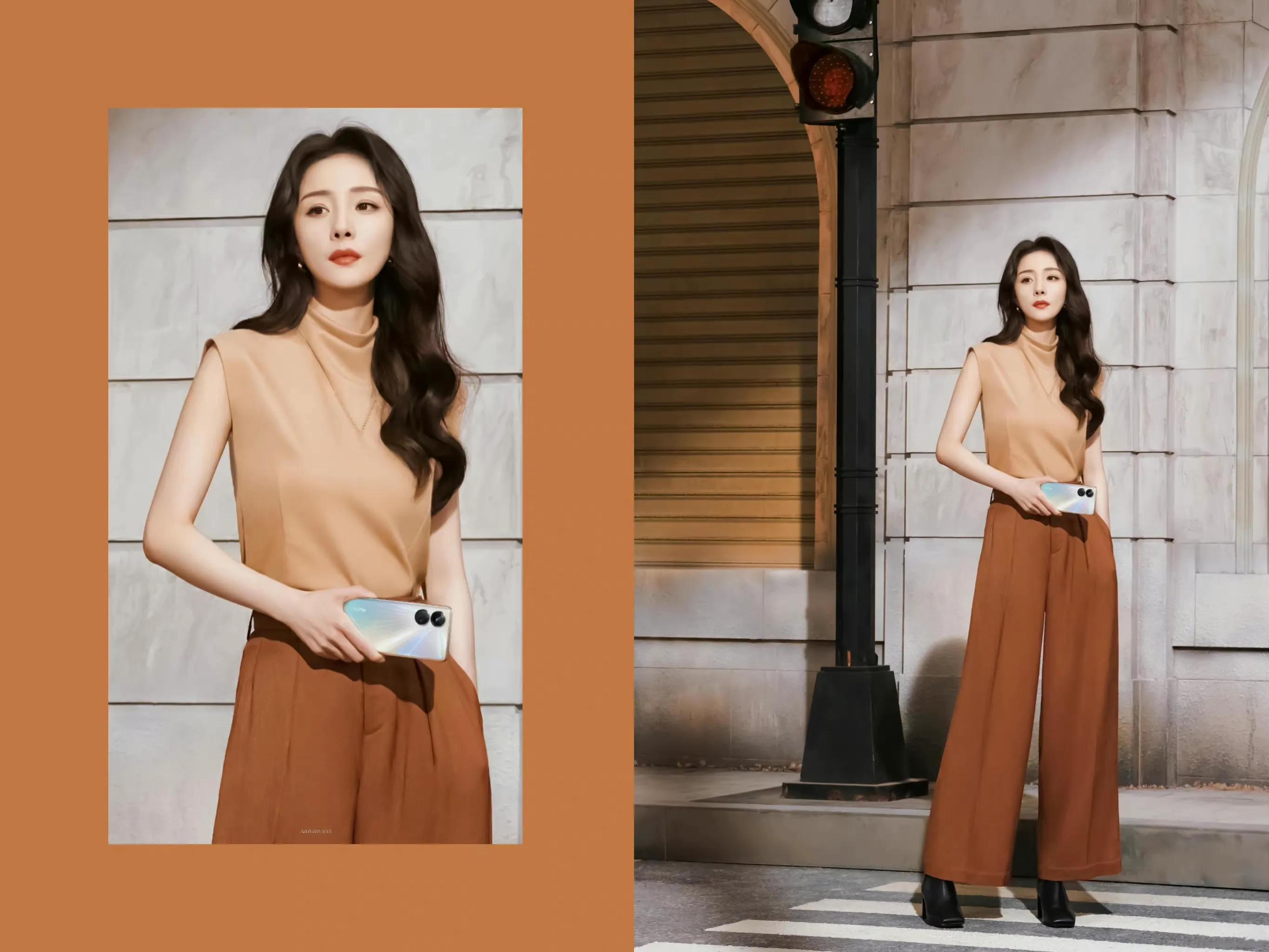 杨幂的整套穿搭遵循的是同类色搭配原则,明暗不同的两种同一类颜色相配,比如,青配天蓝,墨绿配浅绿,咖啡配米色,深红配浅红等,同类色配合的服装显得柔和文雅。同色搭配是为稳妥、为保守的方法。这种方法可以构成一个简朴、自然的背景,安定情绪,有舒适的感觉。
