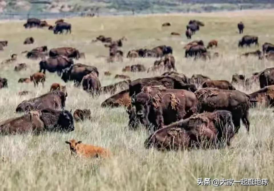 美国怀俄明州:一群野牛在赖特镇附近吃草。在英国,野生欧洲野牛将于 6000 年来回归,明年在肯特放生一小群。