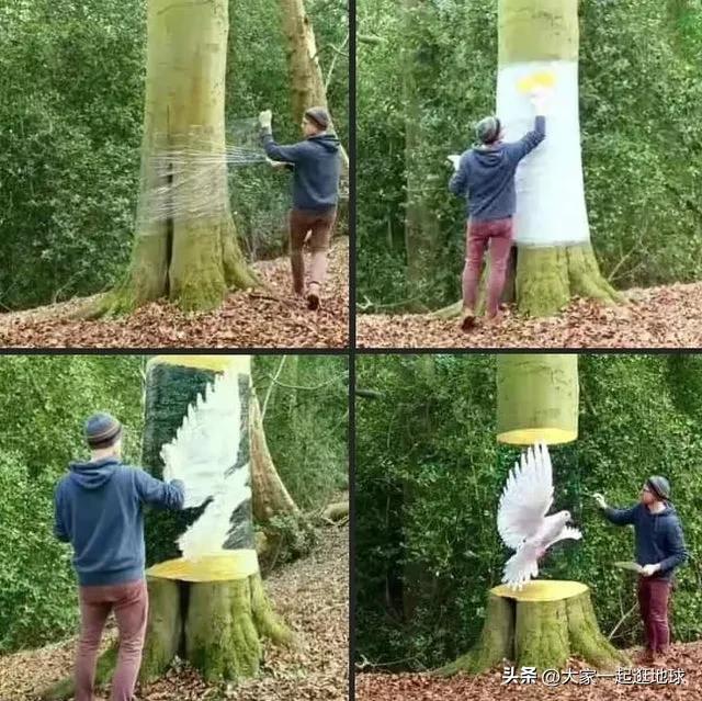 原本是一棵树,经过画家的一番操作,看起来不像树了,像一只飞翔的鸽子。