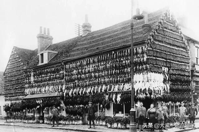 这张照片显示了维多利亚时代肉店店面的样子,好多肉挂在店外。大约 1890 年代至 1900 年代,