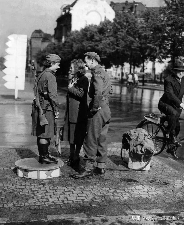 在盟军占领柏林期间,一名在执行交通任务的苏联女兵与英国士兵聊天。1945 年 7 月。