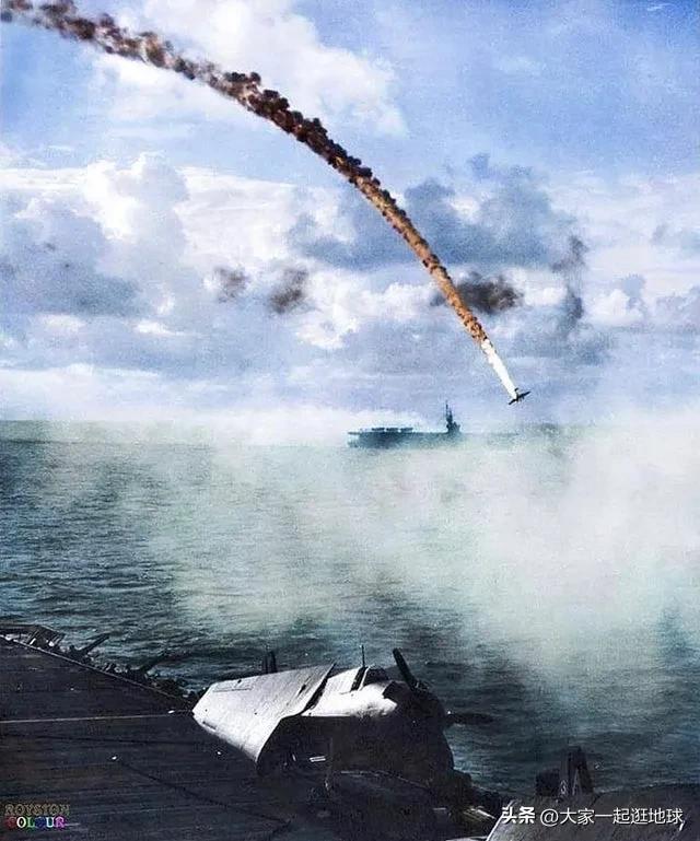 1944 年 6 月 13 日,一架日本神风敢死队飞机,在试图攻击太平洋马里亚纳群岛的航母时被击落。这张照片是从护航航母 USS Kitkun Bay (CVE-71) 上拍摄的。