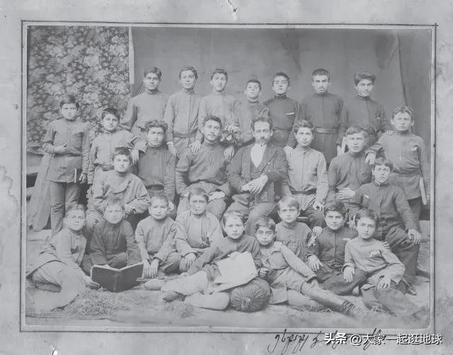 年轻的斯大林与他的同学合影,当时13 岁,后一排正中那个是他,拍摄于1892 年的格鲁吉亚哥里教会学校。