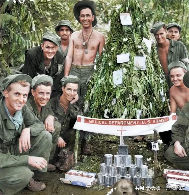 1942 年,在巴布新几内亚的美国士兵和他们自制的圣诞树,圣诞树上装饰着手术药棉和香烟盒。