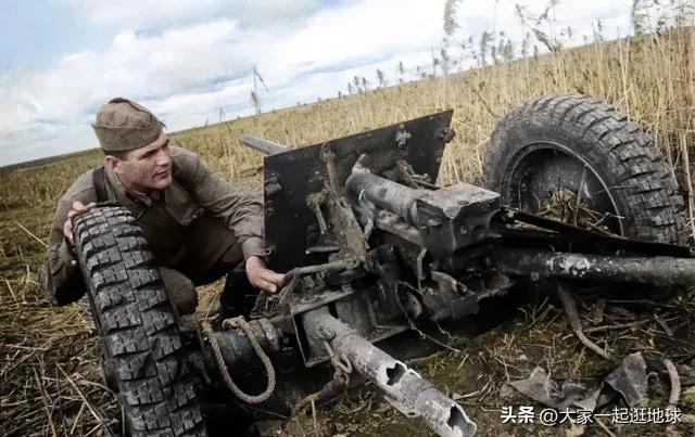1942 年 4 月,一名红军少尉在检查损坏的德国 37 毫米反坦克炮 PaK 35/36。