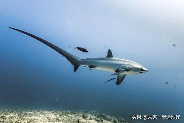 长尾鲨的标志性长尾巴!广泛分布在大西洋、太平洋的热带、亚热带和温带各海区。化石见于第三纪至近代。