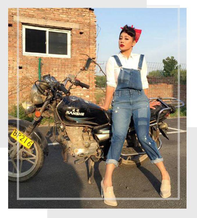 宁静的牛仔背带裤搭配白衬衫,精致的丝巾蛋卷头,烈火红唇,再加上应景的背景,有上世纪五十年代的感觉。