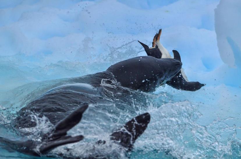 南极半岛,企鹅跳进风平浪静的海里却不幸落入了豹纹海豹的圈套。