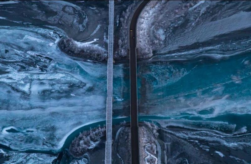 阿拉斯加的冰川水在路边流动,1月初处于半冰冻状态的水道色彩斑斓。