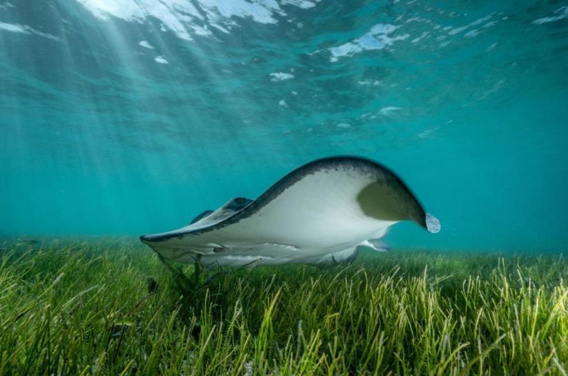 巴哈马群岛光线充足的海洋中,大黄貂鱼像猛禽一样在海草上俯冲而过。