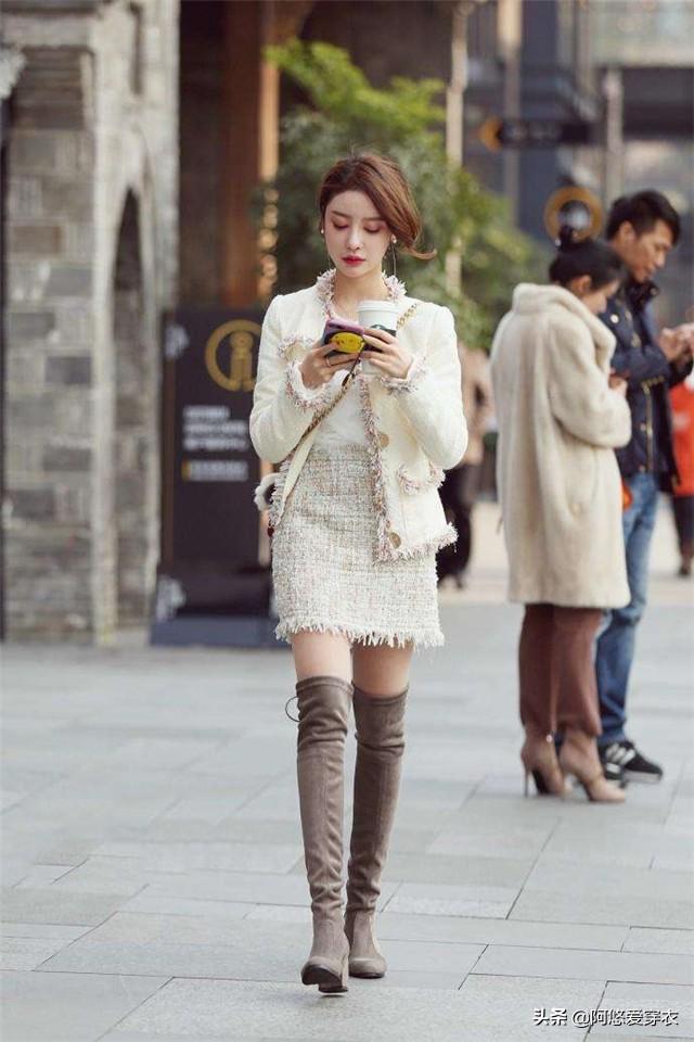 小香风套装比较难搭配,所以可以尝试小香风+长靴的标准穿法哦,时尚又容易参考。