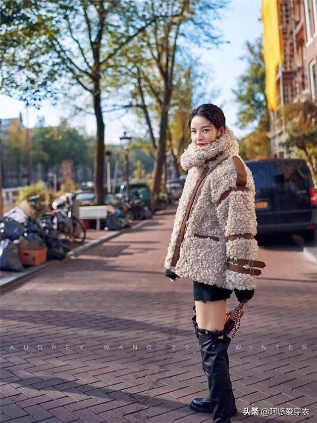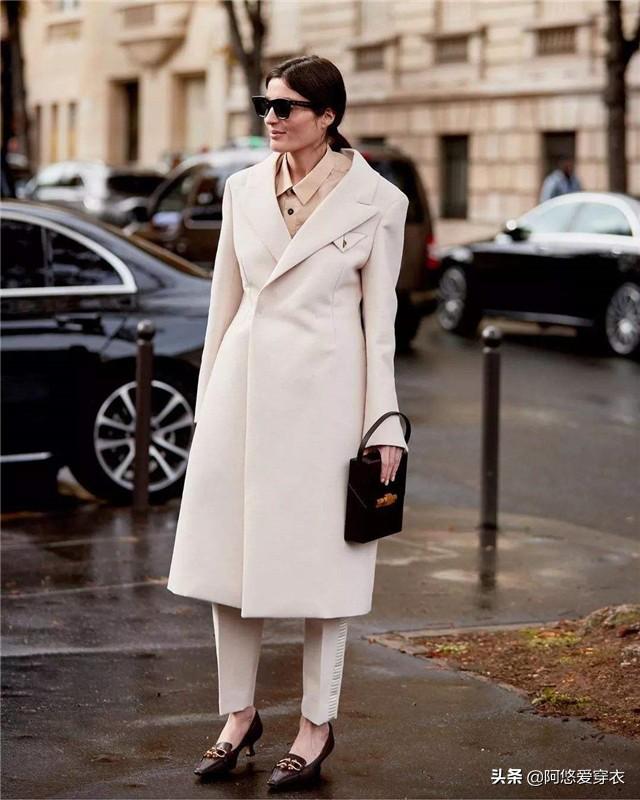 有一个穿搭法则,叫做“上厚下瘦”,说的就是上半身穿很厚的外套,下半身穿修身的裤子或者裙子,这身搭配就是这样的穿法。