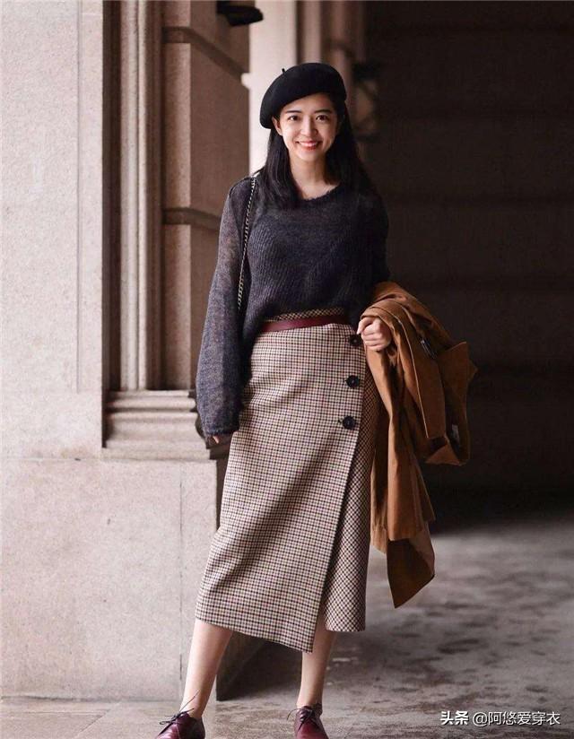 其次,格纹材质也是复古又高级的,如果面料光滑有质感,加上格纹就很有欧洲贵族的感觉。但是上半身比较胖的妹子不要尝试这也的针织衫,会很显胖。