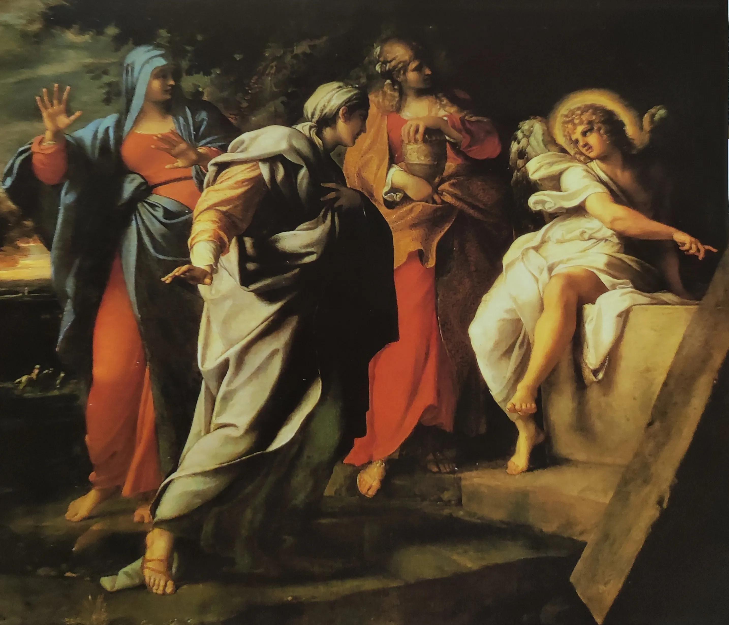聊一聊16世纪意大利画家卡拉奇笔下的有关女性题材油画作品《圣墓前的圣女们》这幅油画作品中总共有4个女人,其中三个是圣女,另外一个是天使,她们4人在一个光线不是很亮的花园中,不过画家还是将一定程度的亮光洒落在画中四个女人身上,这主要是让观赏者让人们可以很清晰的看到她们的一举一动和表情,