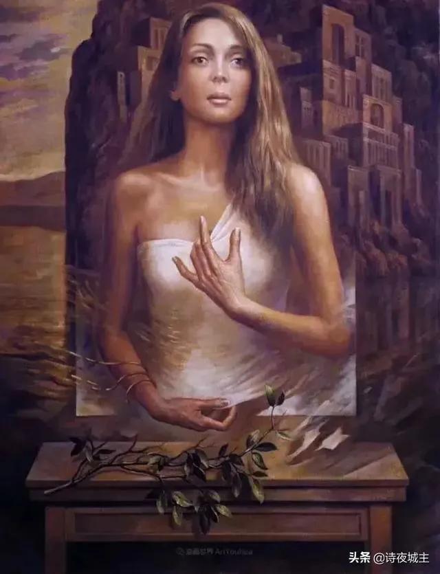 在画面的右边,坐在石阶上的,穿着白色衣服,留着金黄色锦发的女子是天使,她的头上有一道圆形黄色的亮光,而且她还长了一对灰色的翅膀,天使左手撑着台阶,右手指向墓地,不过我们也看不清这墓地到底是谁的,因为那里一片黑暗;