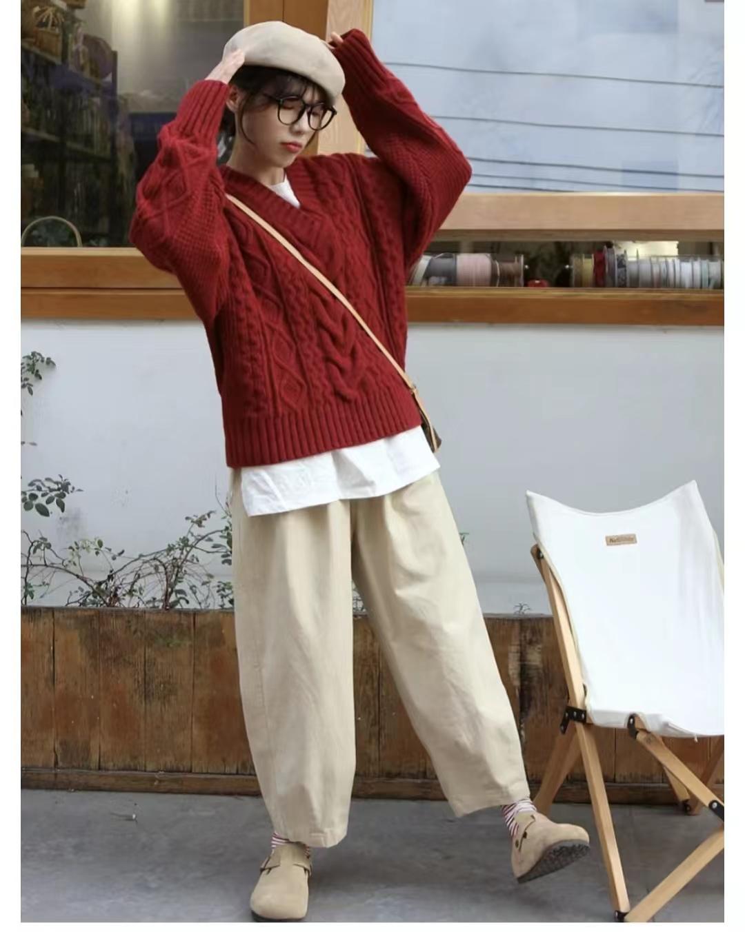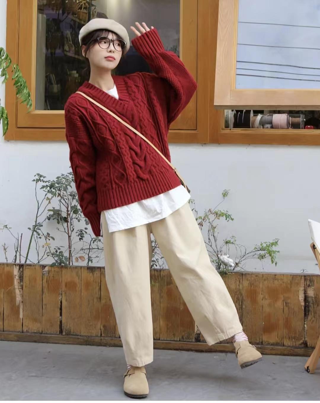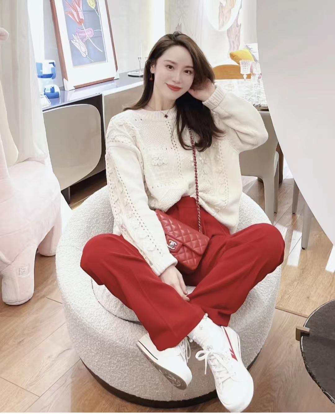 米白色钩花山羊绒温柔又清纯,如果红上衣比较难驾驭,可以尝试下红裤子,距离脸部较远,可以稍稍减低颜色带来的视觉冲击感,红色裤子提亮整体色彩,为穿搭增添一份新鲜感,更让人眼前一亮~