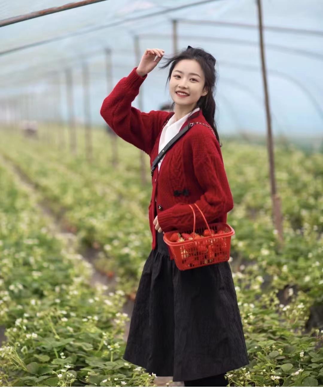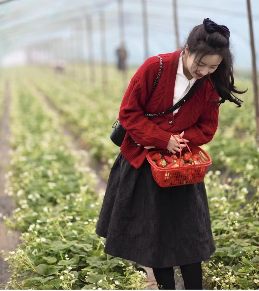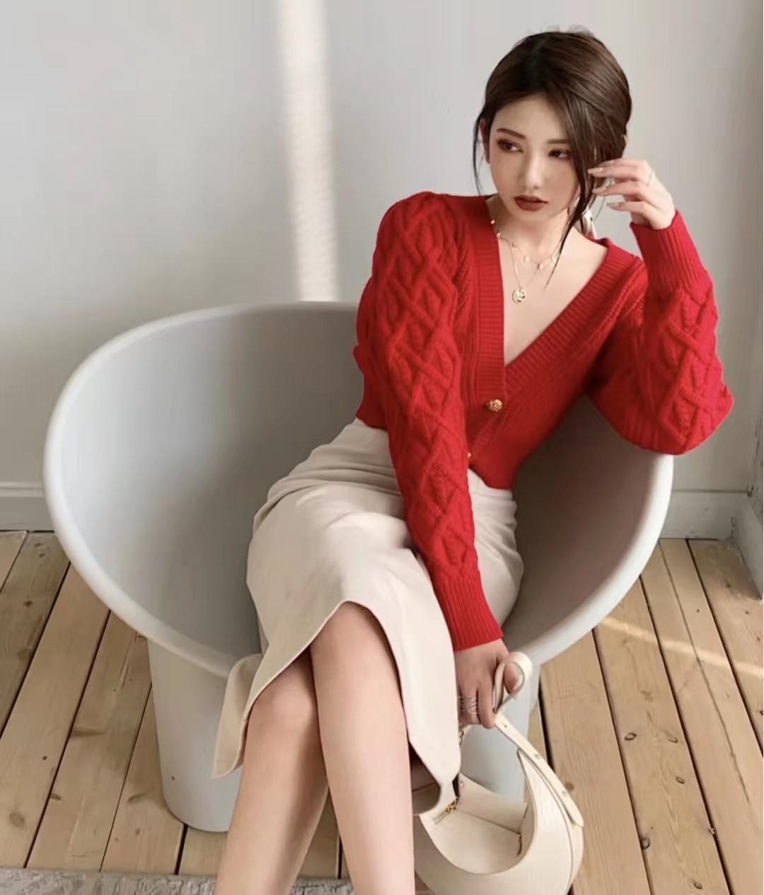 红色开衫喜气洋洋的,内搭白色衬衫+黑色半身裙,怎么感觉文静又俏皮,这套还挺适合过年见长辈的,北方的姐妹们可以搭配一件黑色的羽绒外套兼顾保暖~