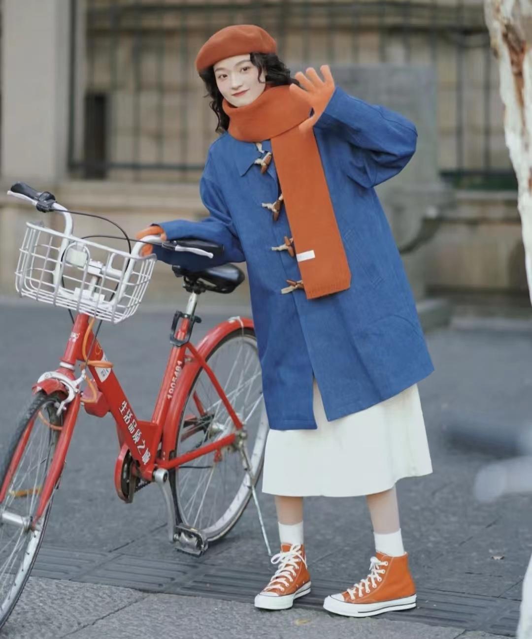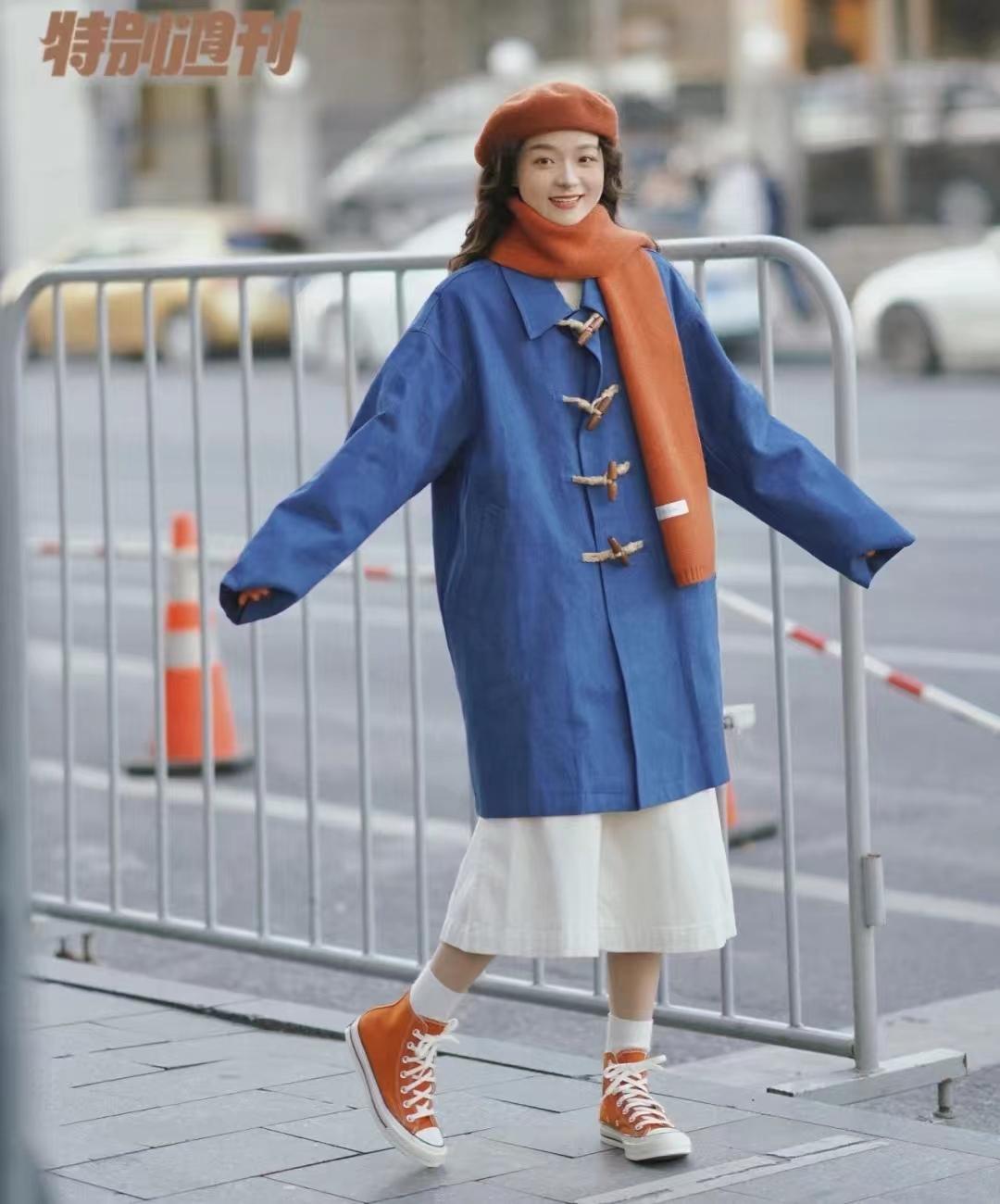 这身色系真的好绝,橙红色搭配牛仔蓝,衣服单品都用简单的蓝白,在帽子、手套、围巾、鞋等配饰上呼应撞色,整个吸睛又元气,日系色彩感满满~