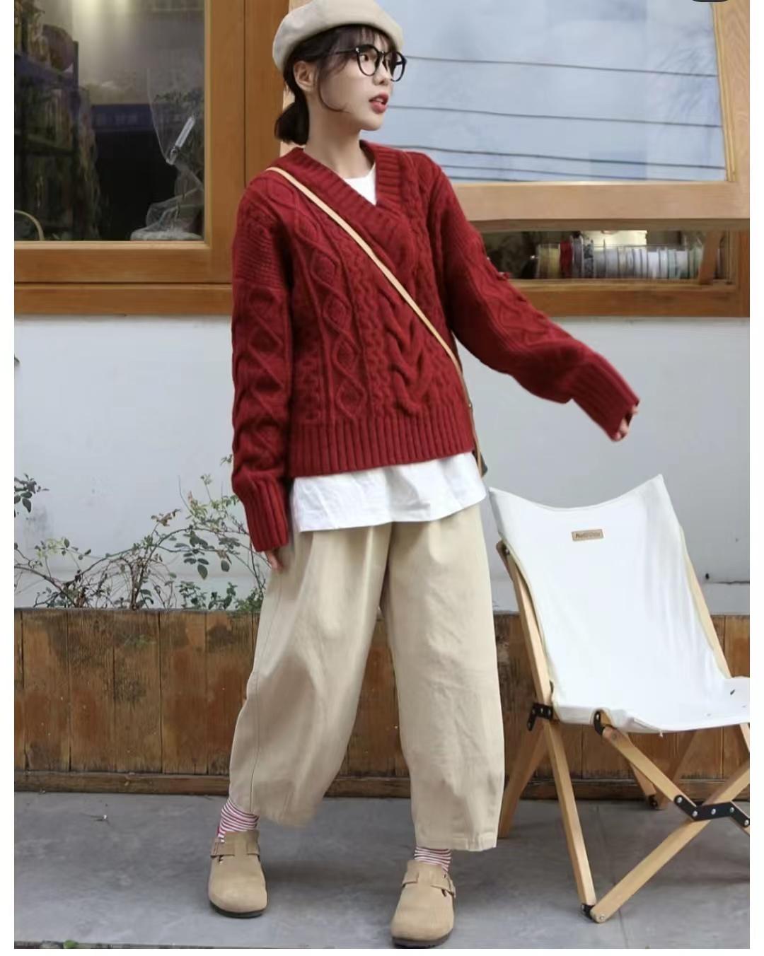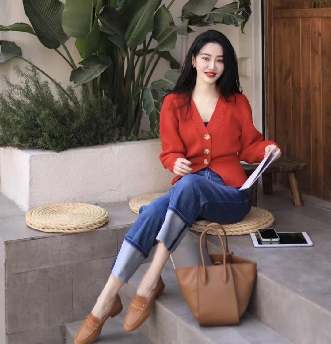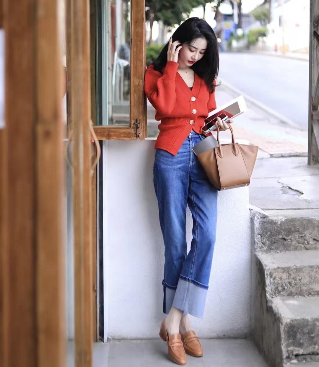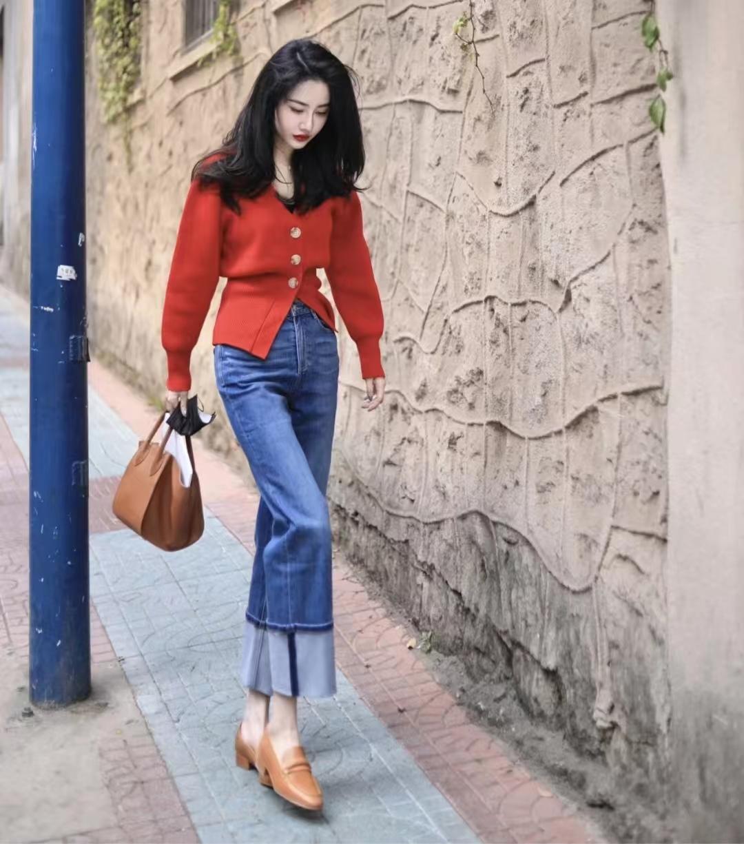 红色针织衫日常单穿/叠穿/做披肩都可,收腰下摆微开的设计,既显腰身又能视觉提升腰线,是显瘦又显高的单品;搭配复古蓝直筒牛仔裤+棕色乐福鞋,显高显瘦显腿长~