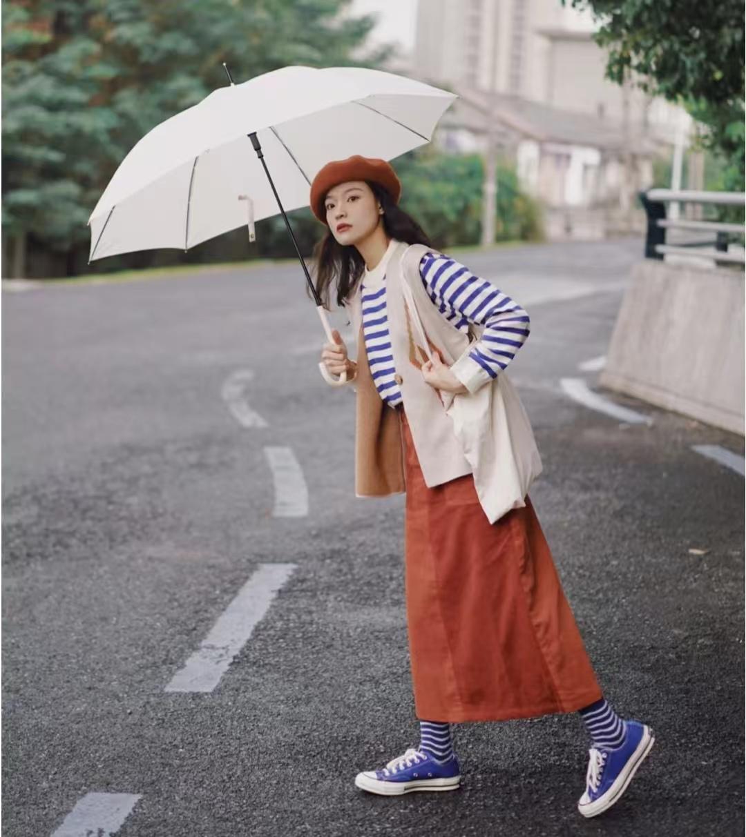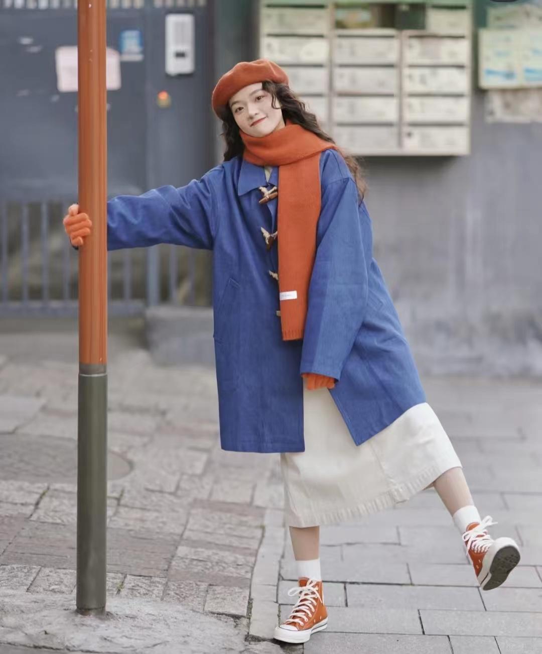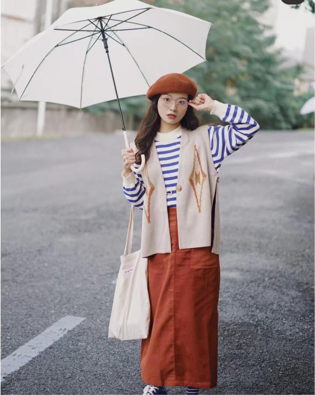 蓝色条纹衫+米咖色马甲+橘红色灯芯绒半裙,红蓝撞色吸睛抢眼,红帽子和裙子呼应,鞋、袜和条纹衫呼应,整体配色有日杂感,拍照都上镜!