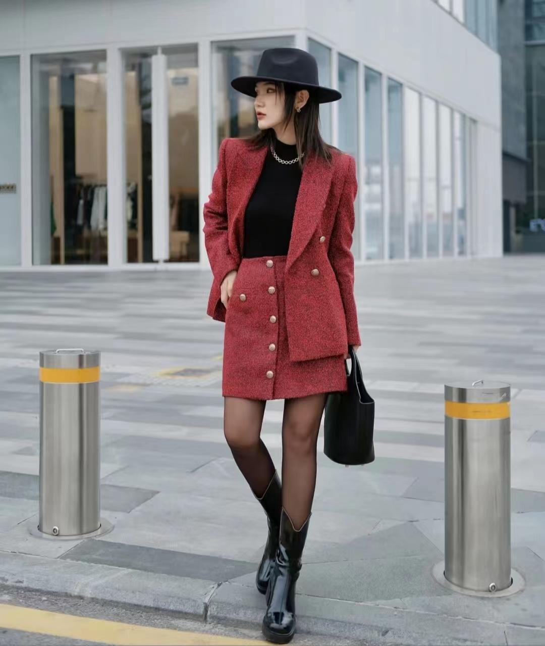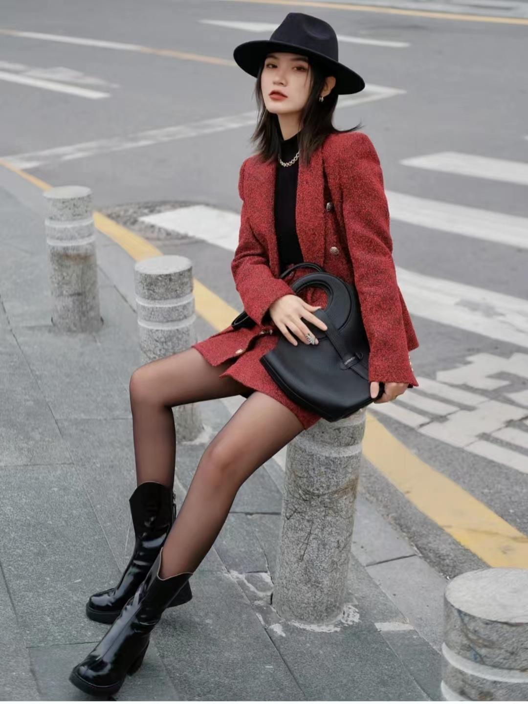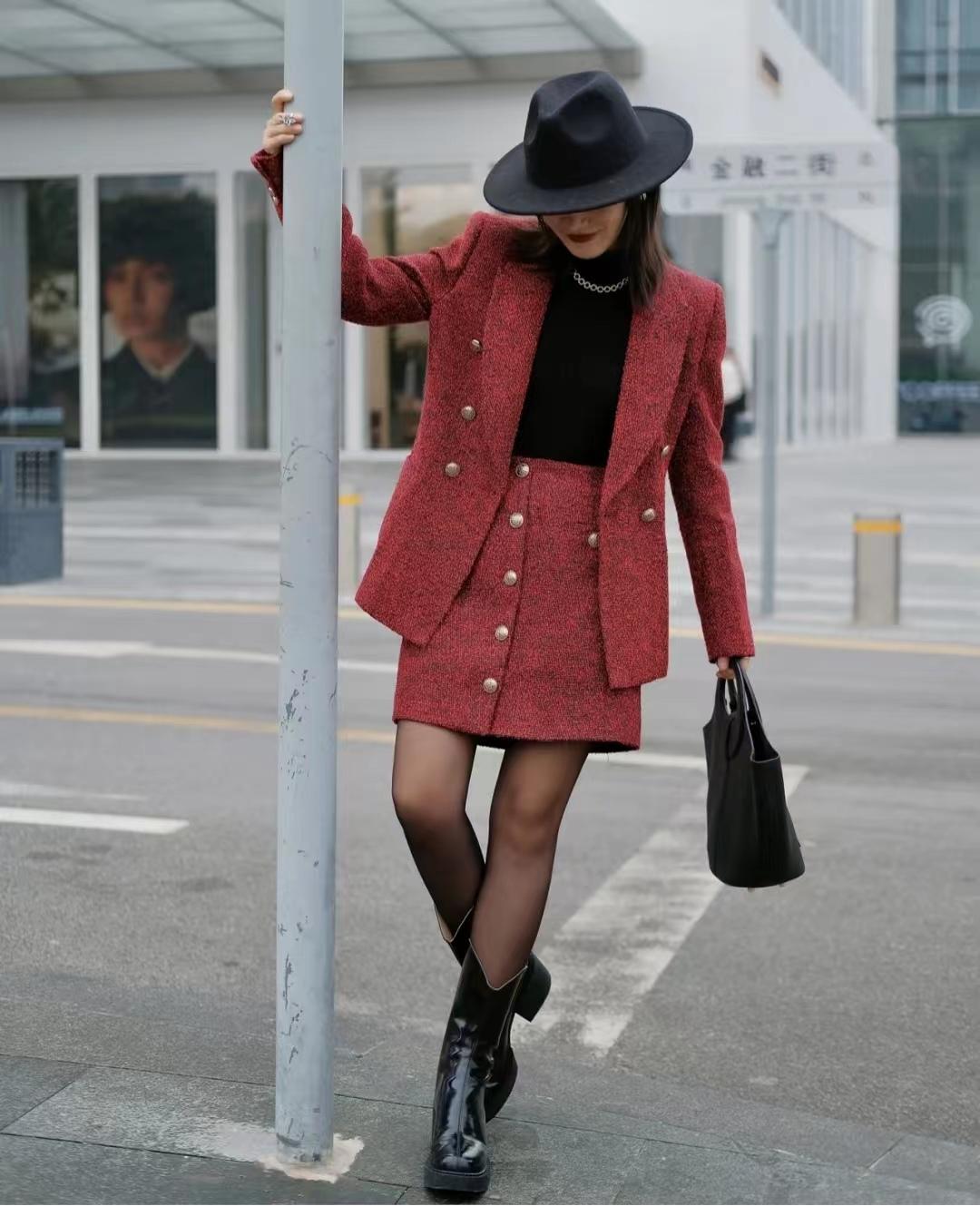 look2 红色粗花呢西服套裙+黑色打底/黑靴