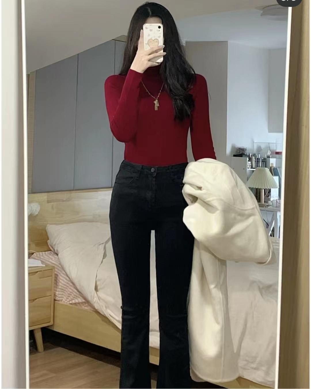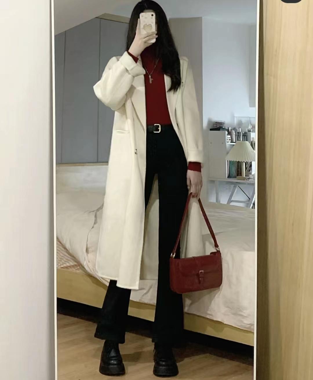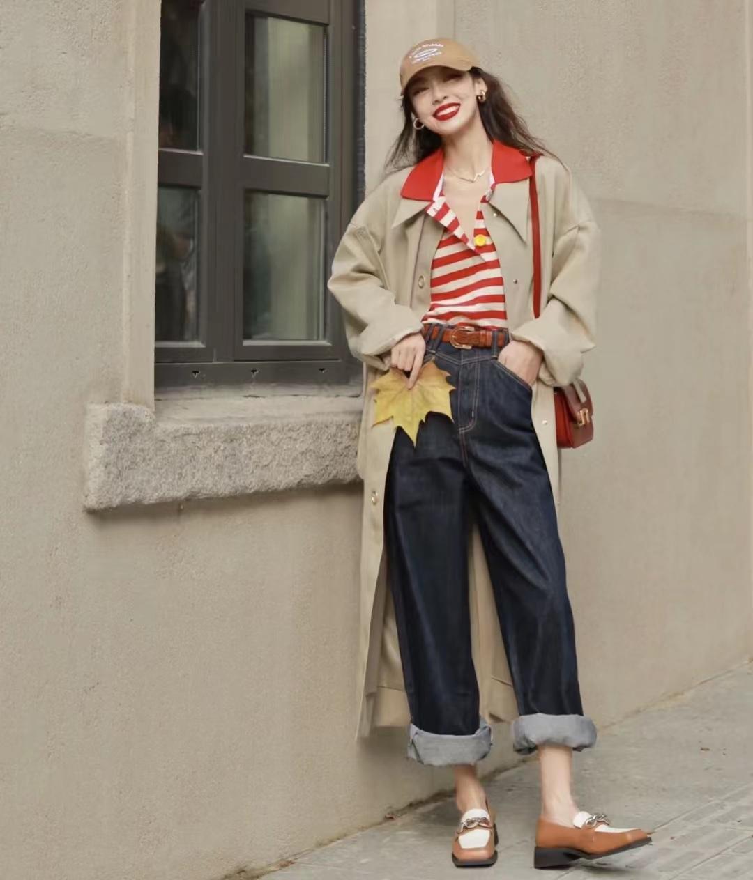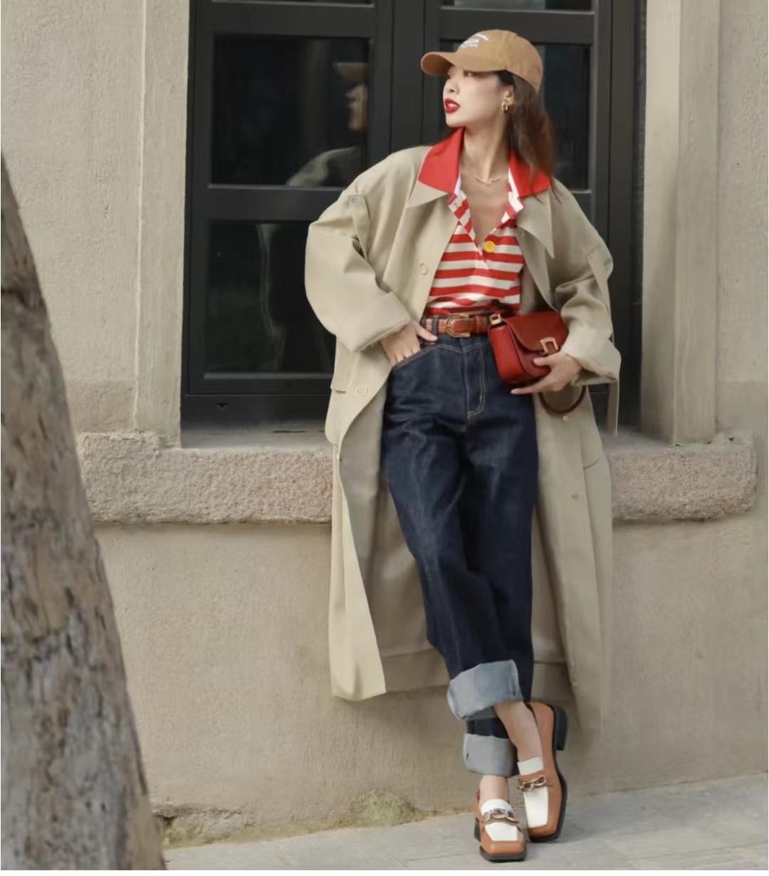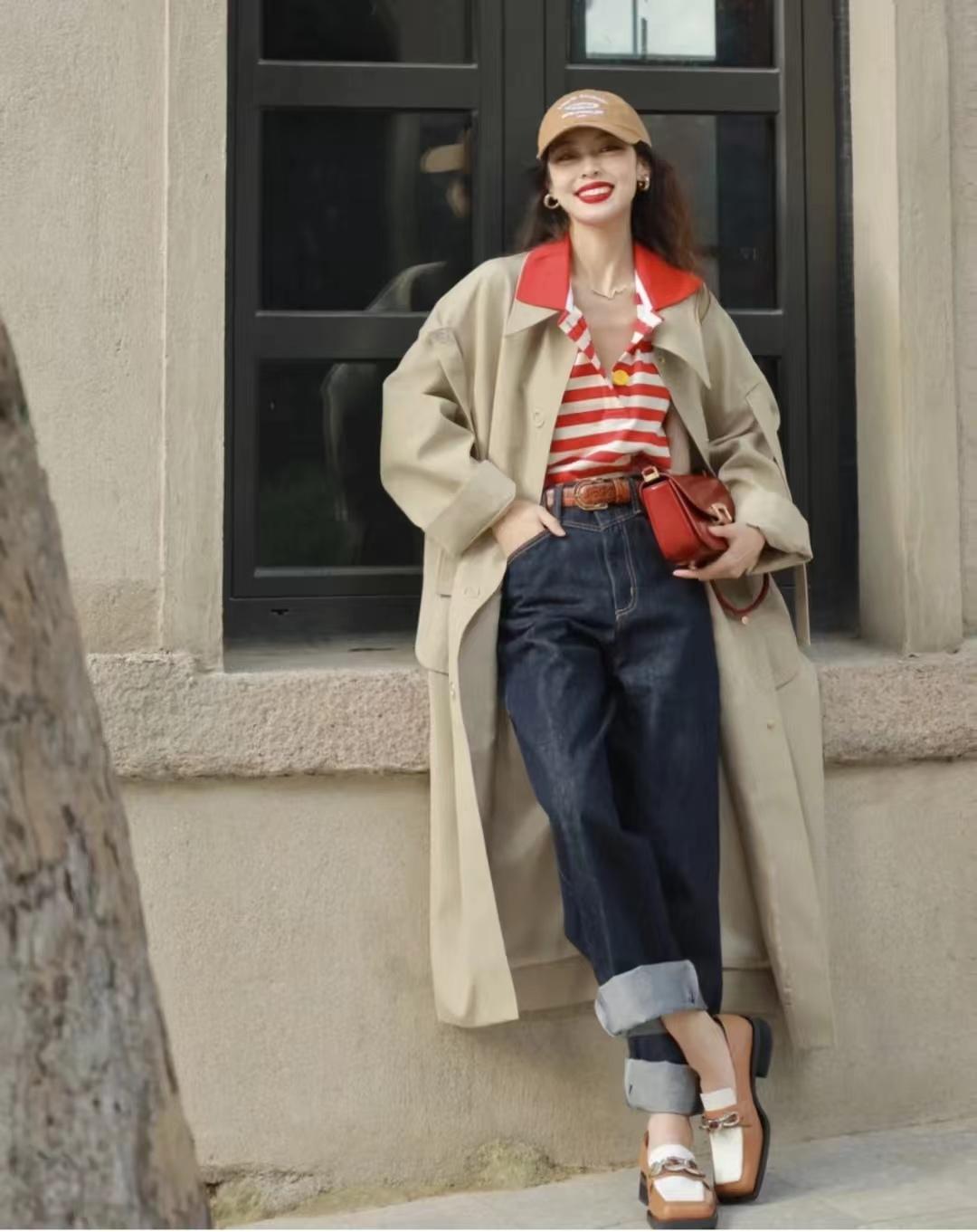 米色大衣上身温温柔柔的很气质,内搭红色修身+黑色微喇牛仔裤和黑色皮鞋,红色的小包和内搭呼应,并且给这套点睛+显高级~